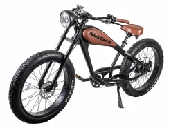Le terme Café Racer désigne à l’origine une moto anglaise des années 1960, transformée en moto de sport et considérée comme un symbole de la scène underground de l’époque. Elle doit son nom aux rencontres de divers groupes de rockers qui se réunissaient dans des cafés notoires de Londres et qui organisaient des courses de moto illégales. Aujourd’hui, Mach utilise le terme Café Racer pour décrire un vélo électrique débordant de rock’n’roll qui vise à provoquer et qui appelle à une révolution du monde du cyclisme. Ce vélo a le même design de chopper que les motos des années ’60; par exemple, la batterie est intégrée là où se trouve normalement le réservoir d’essence d’une moto chopper. Par ailleurs, la ressemblance à une moto chopper continue grâce à la selle basse et extra-large, combinée à un guidon haut qui vous donne une position de conduite similaire, et aux pneus extra-gros qui donnent une sensation d’invincibilité. Essayez-la et tombez amoureux de ce vélo électrique Chopper magnifiquement conçu qui déborde de rock’n’roll.