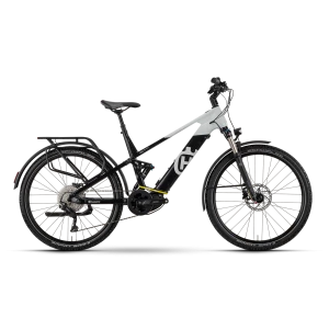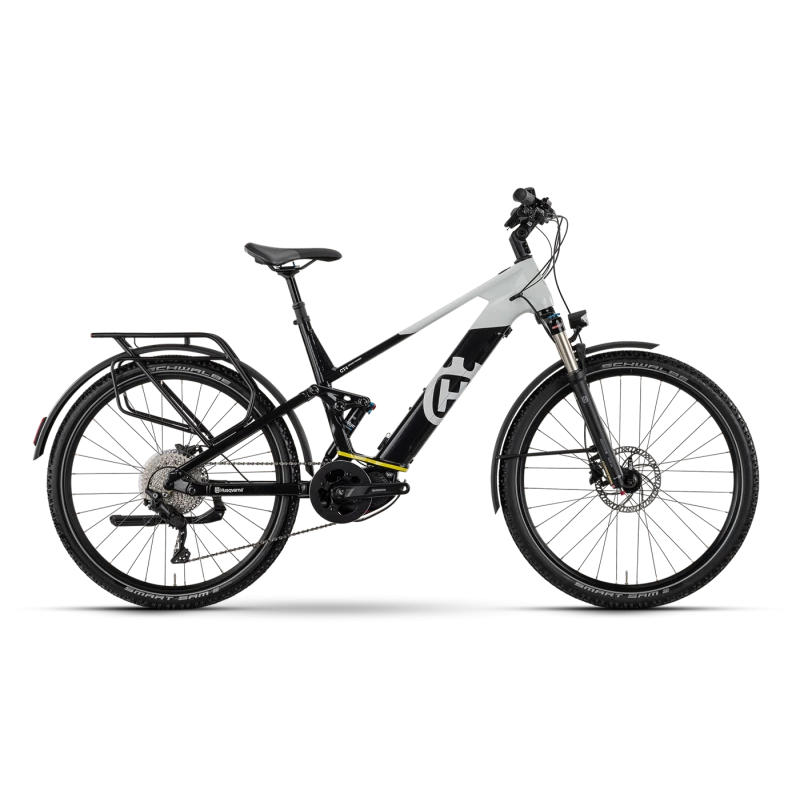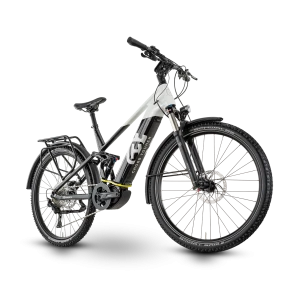 Vélo équipé porte-bagages, gardes boue et éclairages.